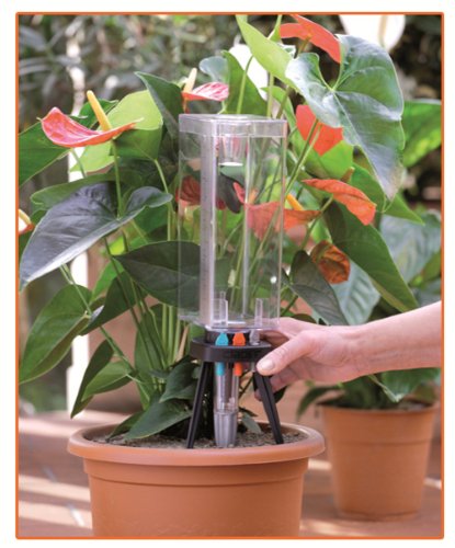This Italian-made watering system keeps your plants healthy, eliminating your daily watering routine. Ideal for people who love plants and for those who travel. With 67-ounce capacity tank and 4 color-coded drippers waters a large size plant (10-inch pots or bigger) up to 20 days. Idris Kit irrigates directly into the plant roots, avoiding evaporation, with one of the following daily water releases: 3.4-ounce up to 20 days, 5.1-ounce up to 13 days, 6.8-ounce up to 10 days or 10.1-ounce up to 6 days. This non-clogging system has an adjustable tripod for perfect stability, even with a full tank. Equipped with a built-in funnel for easy refilling and a graduated scale to read water level. Unit is 100% quality controlled during manufacturing process. 2-year warranty.