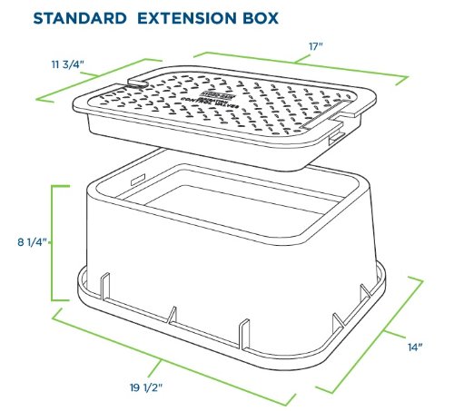 53213 Features: -Extension valve box.-Adds 4'' to 6'' on standard valve box.-Built-in nut for locking lid, bolt not included.-Easy-open overlapping lid. Construction: -Heavy plastic construction. Dimensions: -Dimensions: 7'' H x 17'' W x 11.75'' D.