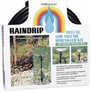 The Raindrip low-flow sprinkler kit provides an ideal means for watering ground cover, flower beds, new planting, and hillside planting. The included sprinkler heads are adjustable and feature three different spray patterns. The kit effectively waters up to 600 feet of foliage and reduces water consumption by 50 percent when compared to conventional sprinklers. The kit can be expanded by coupling multiple kits together. The kit comes with 75 feet of 1/2-inch poly hose, 100 feet of 1/4-inch tubing, two full-circle adjustable sprinklers, two 1/2-inch hose end clamps, one 1/2-inch compression tee, five half-circle adjustable sprayers, five quarter-circle adjustable sprayers, one 1/2-inch compression coupler, eleven 1/4-inch barbed connectors, one 1/2-inch compression elbow, one 3/4-inch hose thread swivel to 1/2-inch compression adaptor, one 30 gph pressure compensating flow control, eleven 8-inch support stakes, eleven 4-inch poly risers, one 3/4-inch hose/pipe anti-syphon and filter washer, one 3/4-inch thread pressure regulator preset at 25-30 PSI, one hole punch, one 3/4-inch pipe threaded coupling, and 10 hole plugs.